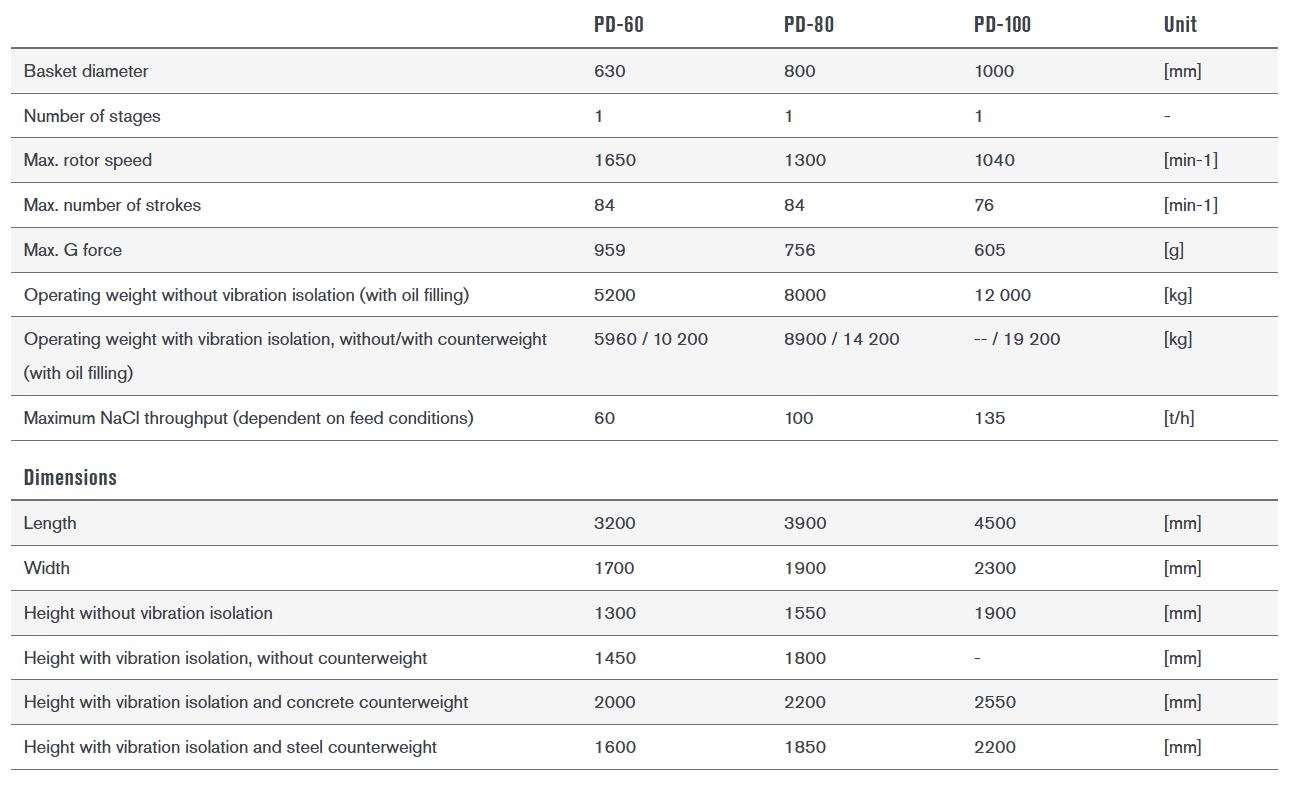 The mechanical basis of the patented D-ACT® pusher centrifuges type PD-60 to PD-100 correspond with the very successful pusher centrifuge type P-60 to P-100. The machines are suitable for products with good dewatering characteristics with medium to large particle size.