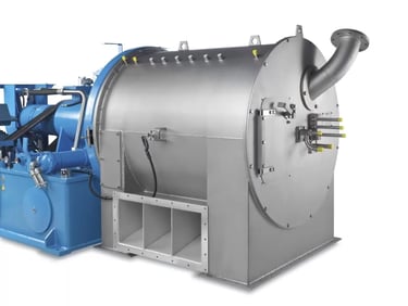 Due to the kidney-shaped outlet ports the suspension can build a cake and be discharged on both sides of the pusher plate. With this, the D-ACT® pusher centrifuge achieves an up to 80% higher throughput compared to a standard 2-stage pusher centrifuge of the same size with an up to 20% lower specific energy consumption.